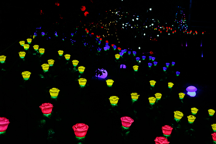 漫步于綠蔭隧道中,看樹影斑駁,賞藤花繽紛絢爛。由勇電LED燈具打造的夢幻長廊,以門框的形式體現(xiàn),燈光明暗變化中,顏色也隨之跳動,如同時(shí)空穿梭、如夢如幻...