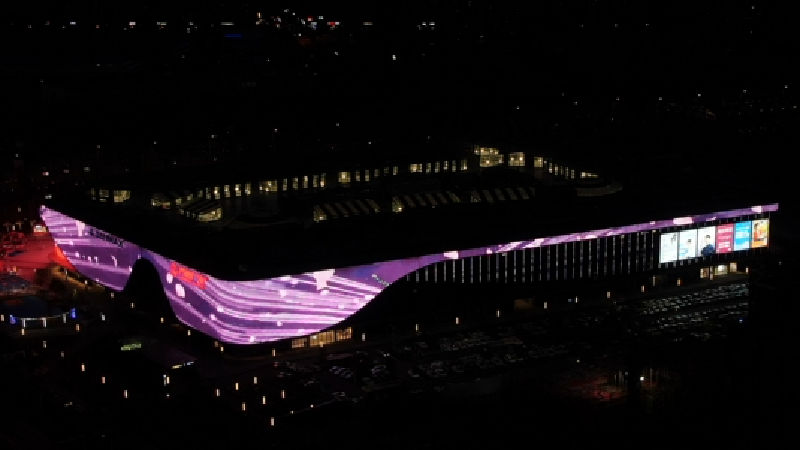 東西湖萬達廣場夜景照明以現(xiàn)代大氣為理念,結(jié)合立面漸變的網(wǎng)格肌理,采用勇電LED點光源運用于戶外景觀照明,打造了一塊面積達5500㎡的戶外媒體屏。