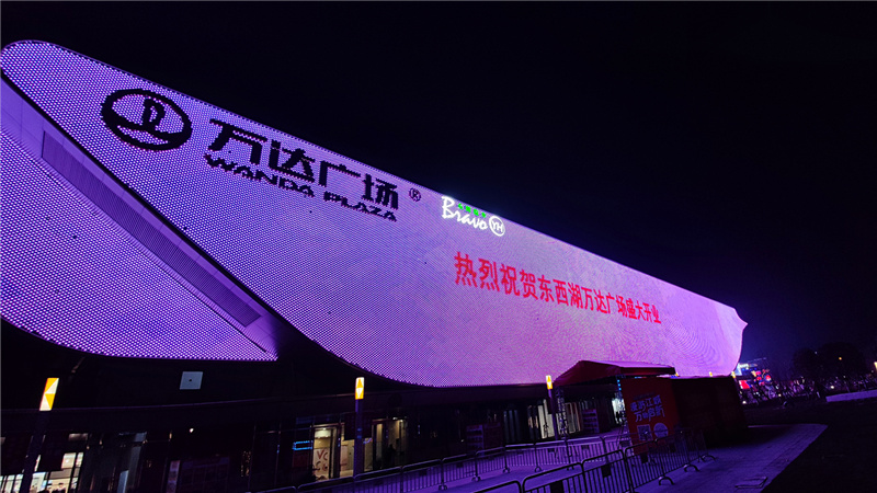 通過光影打造細膩、精致的商業(yè)氛圍,形成時尚靈動、大氣現(xiàn)代的夜間整體立面風格,以大面積媒體屏彰顯東西湖萬達廣場商業(yè)地標建筑的風范。