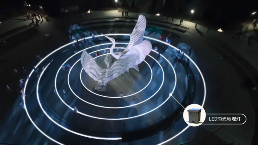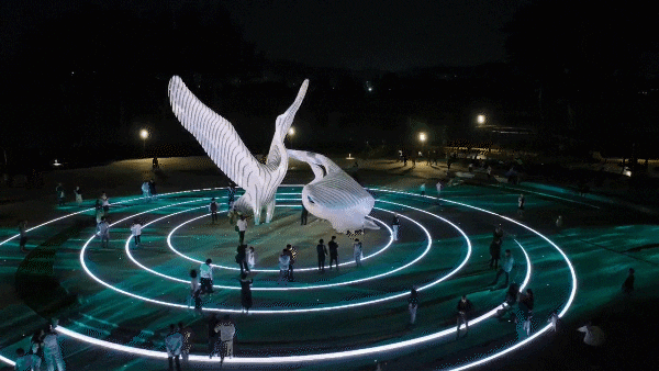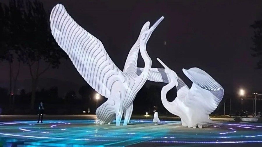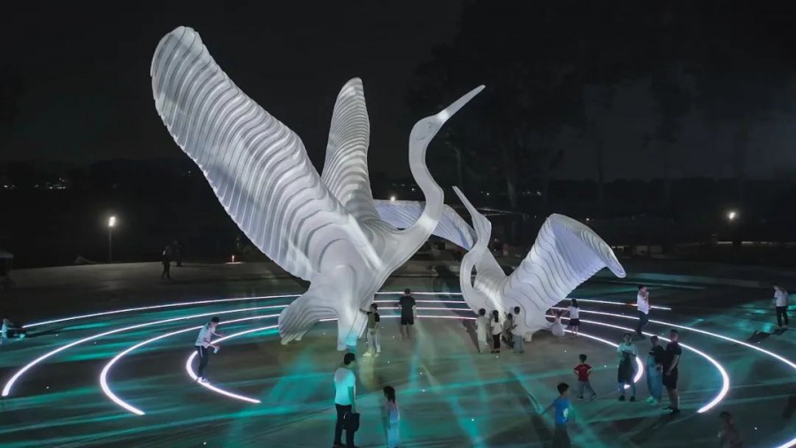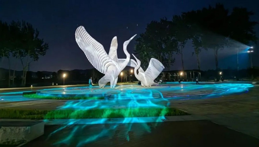 當(dāng)燈光亮起,如同春風(fēng)吹起內(nèi)夾河河面漣漪,與展翅嬉戲的白鷺雕像呈現(xiàn)一動一靜的美好畫面,賦予雕塑動態(tài)光影的魅力。
