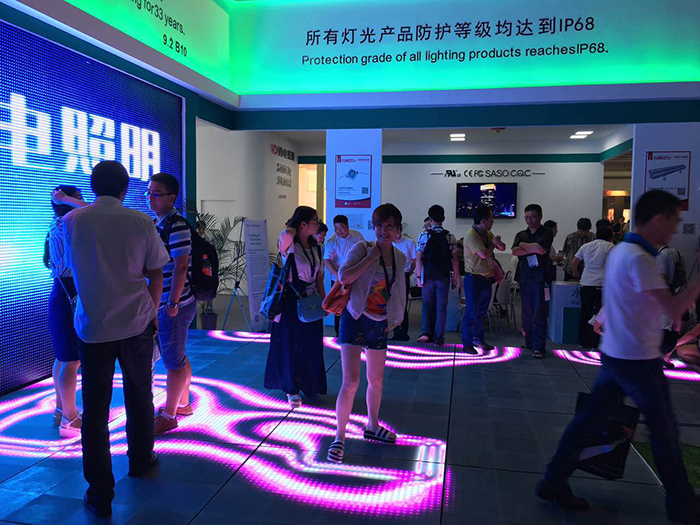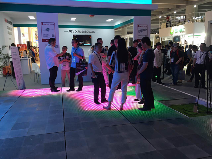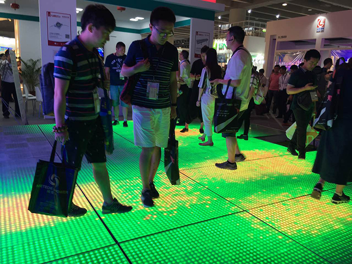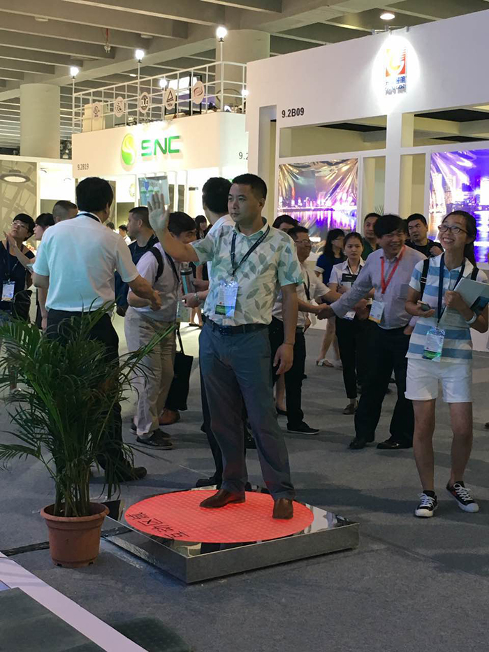 展會上,勇電照明此次推出的“智能化燈光互動控制”技術(shù)引起了很多新老客戶的關(guān)注,在智能燈光互動體驗區(qū),人們站在探測器前方,通過移動手掌來控制LED屏上動畫的顯示,還可以站在地磚屏上,通過人體的移動來帶動地面燈光的走勢,這種可單人可多人同時參與的新穎互動模式吸引了眾多觀眾前來體驗,使人們更近距離的感受到智能燈光所帶來的科技魅力,成為展會上一大亮點。