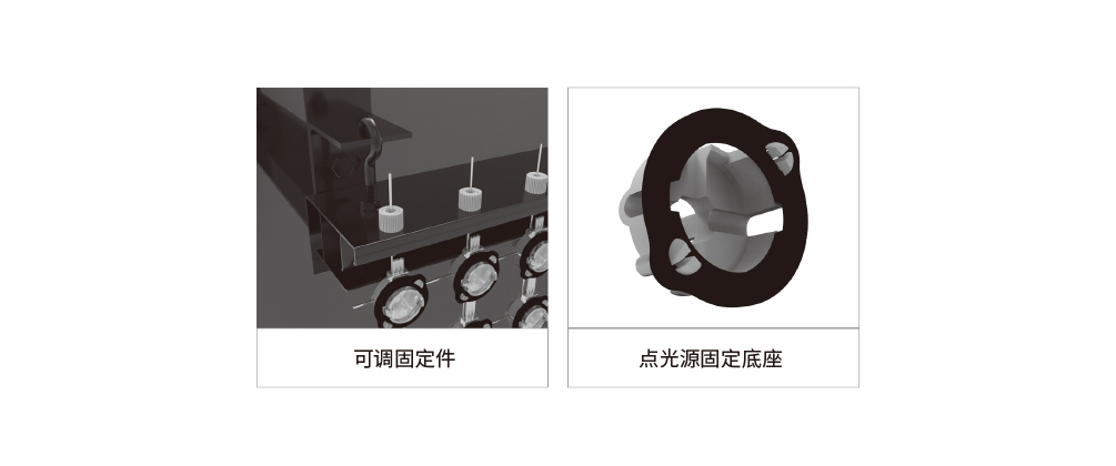 1、使用不銹鋼絲網(wǎng)作為光源固定。 2、采用二次封裝點光源配合塑膠固定件安裝。 3、易安裝、運維、運輸。